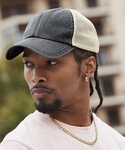 Mid-profile 6-panel design. Soft unstructured crown. Curved peak. Vintage styling. Contrast stitch colour. Snapback size adjuster. TearAway label for ease of rebranding. Contains recycled polyester.